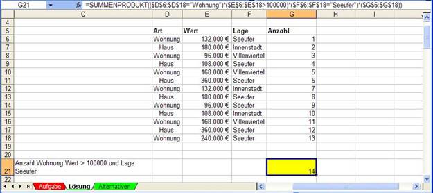 =SUMMENPRODUKT(($D$6:$D$18="Wohnung")*($E$6:$E$18>100000)*($F$6:$F$18="Seeufer")*($G$6:$G$18)).
