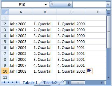 Eine Besonderheit stellt der Begriff 1. Quartal dar: EXCEL beginnt nach dem 4. Quartal wieder mit dem ersten Quartal (Spalte B). Auch eine Kombination wie in Spalte C ist möglich: Das Jahr wird erst hochgezählt nach dem vierten Quartal.