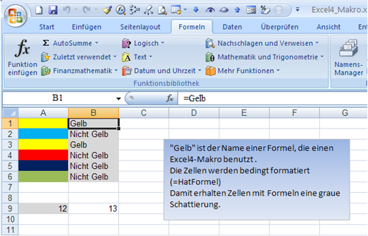 Auch Formeln, die für die Bedingte Formatierung verwendet werden, können Excel4-Makros benutzen.