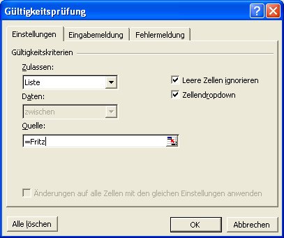 Geben Sie der Liste einen Namen, beispielsweise Fritz. In das RefEdit Feld Quelle (Abbildung 83) ist einzugeben „=Fritz“ (ohne die Gänsefüßchen). |