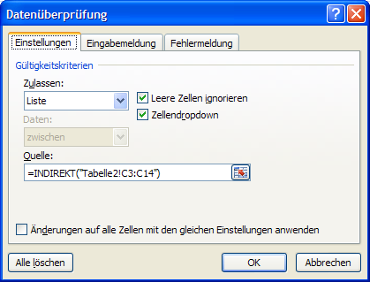 Benutzen Sie, wie in Abbildung 83 gezeigt, benannte Bereiche für Listen, die in fremden Tabellenblättern sind.