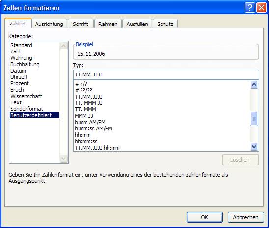 Auch Datumswerte können benutzerdefiniert formatiert werden. Für diesen Fall gibt es die Platzhalter T, M und J.