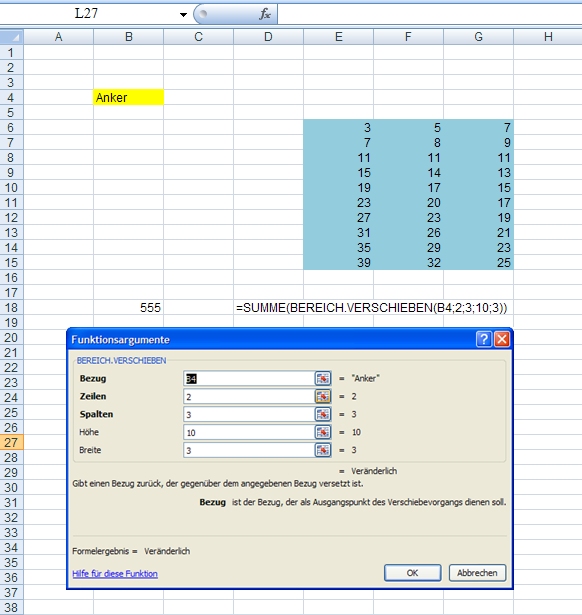 Stattdessen erzeugt sie einen Bezug auf einen Bereich. Dabei gestattet sie, und damit zeigt sie Gemeinsamkeiten mit der Funktion Indirekt, einen Bezug zu berechnen.