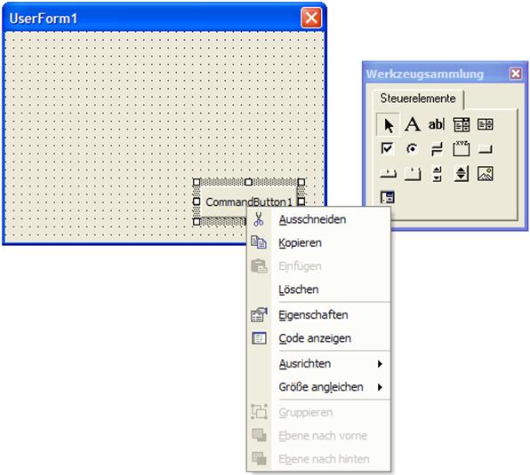 Um ein Steuerelement in die Form zu bringen, klicken Sie das jeweilige Symbol in der Werkzeugsammlung an, lassen dann die Maustaste wieder los und führen den Mauszeiger auf die Form. Es erscheint ein kleines Fadenkreuz, das Ihnen die Positionierung des Steuerelements erlaubt.