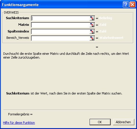 Wie man aus dem Dialogfeld gem. Abbildung 95 ersehen kann, hat SVERWEIS 4 Argumente.