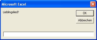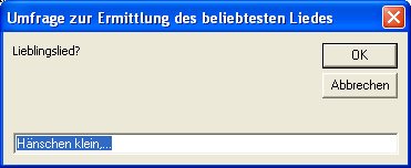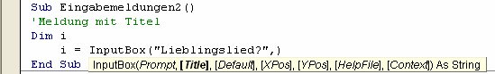 i = InputBox("Lieblingslied?", "Umfrage zur Ermittlung des beliebtesten Liedes", "Hänschen klein,...")