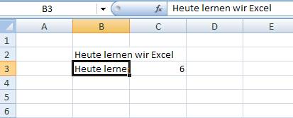 Beachten Sie bitte, dass der Wert der markierten Zelle auch in der Bearbeitungszeile sichtbar ist. Dort steht der vollständige Text, der Wert der Zelle wurde also nicht verstümmelt, sondern nur die Anzeige in der Zelle. |