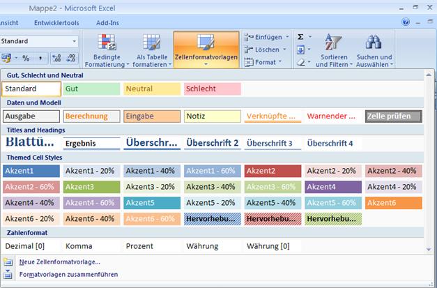 Es öffnet sich eine Palette von vorbereiteten Zellenformatvorlagen. Wählen Sie durch Klick ein passendes Format aus.