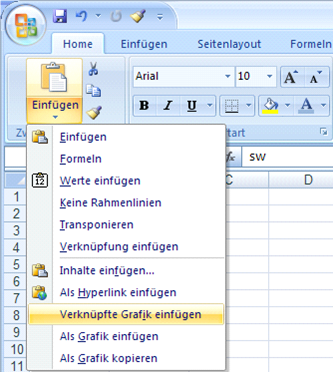 Klicken Sie auf den kleinen Pfeil unter dem Befehl Einfügen. Es öffnet sich ein Menü, das die erweiterten Möglichkeiten des Befehls Einfügen aufzeigt (Abbildung 111). Fügen Sie den kopierten Inhalt als Grafik oder als Verknüpfte Grafik ein.