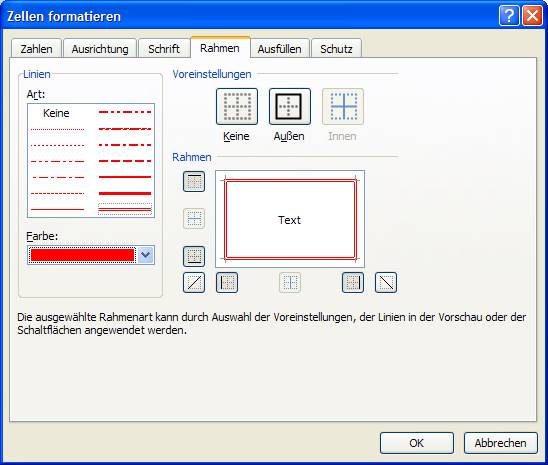 Start – Zellen – Format – Schutz Zellen formatieren, Register Rahmen ruft ein Dialogfeld nach Abbildung 12 auf.