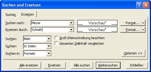 Sie können eine Tabelle oder – seit EXCEL2002 – auch eine gesamte Arbeitsmappe nach bestimmten Inhalten durchsuchen und diese ggf. durch andere Inhalte automatisch ersetzen lassen.