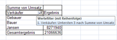 Um mittels einer Pivot-Tabelle eine Top Ten Auswahl vornehmen zu können, nutzen wir die Filterfunktion im Zeilen- oder Spaltenfeld und wählen Wertefilter, Top Ten