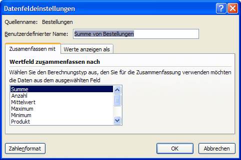 Sie können die Auswertefunktion der Daten einer Pivot-Tabelle ändern. Dazu stehen Ihnen 11 Funktionen zur Auswahl. (Wir kennen das schon von den Funktionen TEILERGEBNIS und ebenso von den Datenbank-Funktionen)