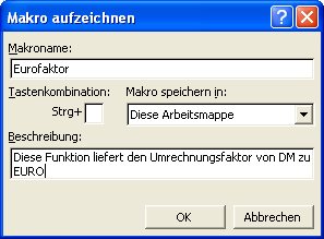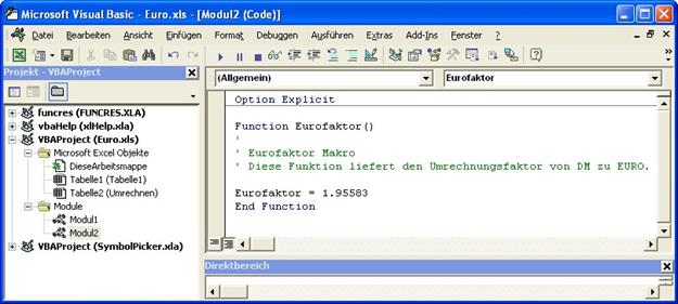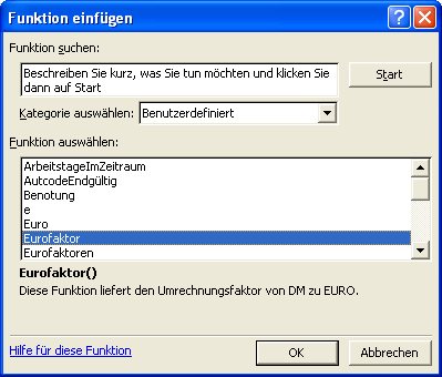 Beispiel: Wir wollen eine Function EUROFAKTOR() entwickeln, die zur Umrechnung von DM in EUR und umgekehrt benutzt werden kann.