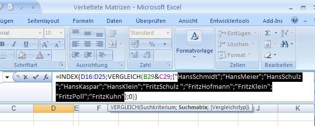 Um die Matrix berechnen und die Teilergebnisse sichtbar zu machen, wird der Bezug zur Matrix in der Formel markiert. Mit F9 wird diese Teilformel berechnet.