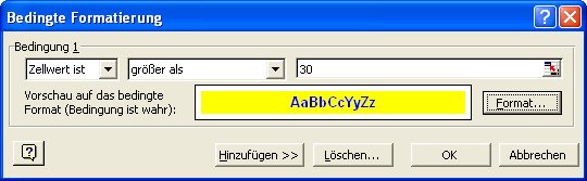 Im Beispiel gem. Abbildung 50 erhält die Zelle eine blaue Schrift auf gelbem Hintergrund, wenn der Zellwert (der eigenen Zelle) größer ist als 30.