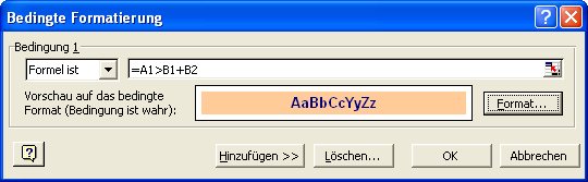 Im Beispiel gem. Abbildung 51 erhält die Zelle eine blaue Schrift auf braunem Hintergrund, wenn der Wert von A1 größer ist als die Summe von B1 und B2.