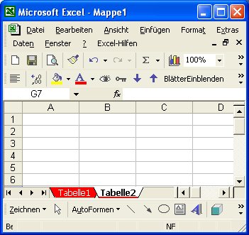 Die rot gekennzeichneten Register (hier mit den Bezeichnungen Tabelle1 und Tabelle2) werden als Blatt-Register bezeichnet. Zum Aufrufen des Kontextmenüs klicken Sie mit der rechten Maustaste eines der Register an.