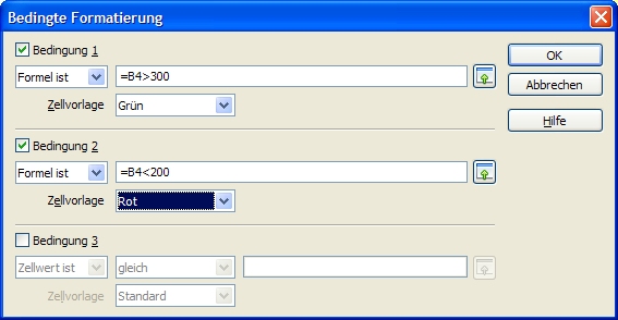 Im Beispiel gem. Abbildung 43 wird der Zelle die Formatvorlage GRÜN zugewiesen, wenn derWert von B4 größer ist als 300 und die Formatvorlage ROT, wenn der Wert von B4 kleiner als 200 ist.