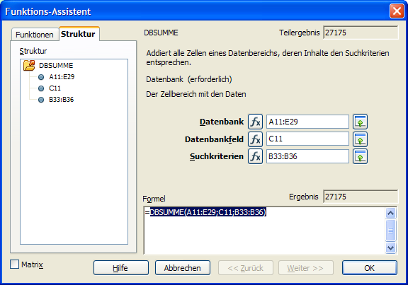Beispielsweise entspricht die Funktion DBSUMME einer Spezialfilterfunktion, bei der Sie anschließend die Werte der sichtbaren Zellen aufsummieren. (vgl. Praxisbeispiel Reise1.ods)