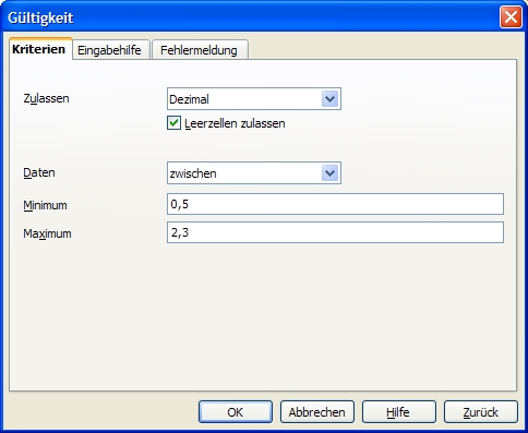 Hier können Sie die Zulässigkeit der Eingabedaten einschränken.