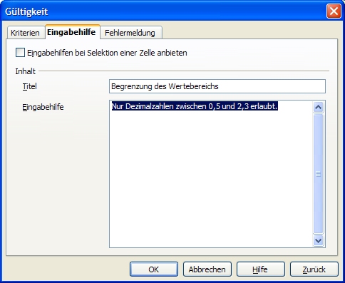 Diesen Text, den Sie im Dialogfeld gem. Abbildung 50 eingeben, wird von OO in einem Infofeld eingeblendet, sobald der Anwender die jeweilige Zelle in der Tabelle markiert, um dort eine Eingabe zu machen. (s. Abbildung 51)