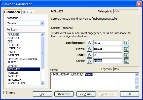Wie man aus dem Dialogfeld gem. Abbildung 61 ersehen kann, hat SVERWEIS 4 Argumente.