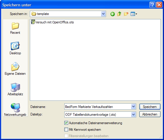 Speichern Sie eine Arbeitsmappe, die als Dokumentvorlage dienen soll, unter dem Dateityp Tabellendokumentvorlage (*.ots) ab.