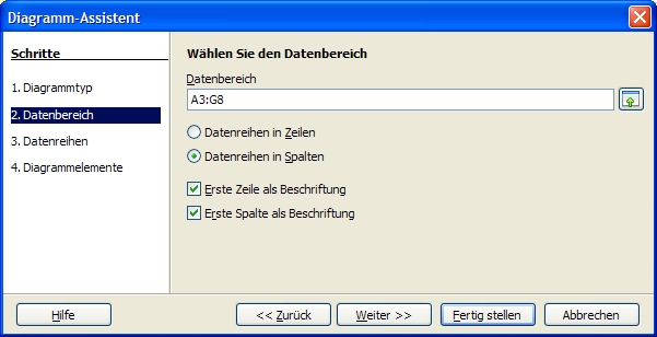 Wenn Sie gut strukturierte Daten mit Zeilen- und Spaltenüberschriften als Diagramm darstellen, so müssen Sie üblicherweise in diesem Dialog nichts verändern.