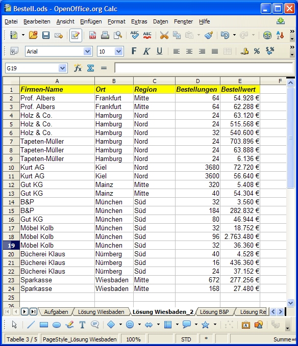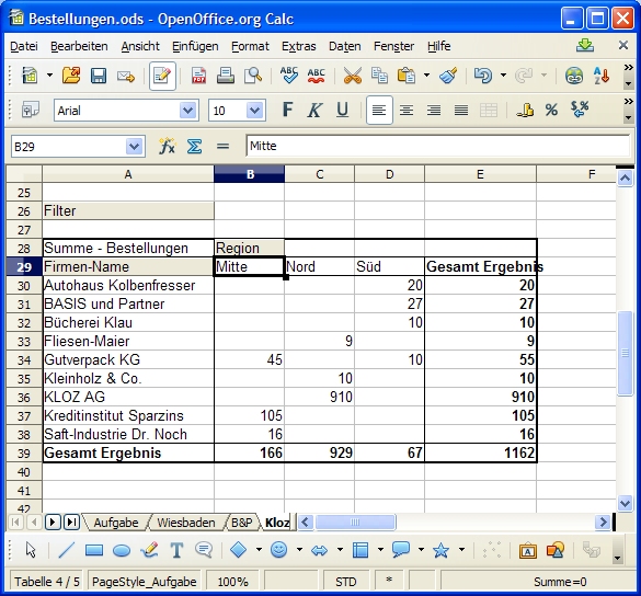 Von dieser OO-Tabelle gem. Abbildung 90 (Bestellungen.ods) wollen wir eine Datenpilot-Tabelle erstellen. Wir markieren die Tabelle und rufen mit dem Befehl Daten – Datenpilot - aufrufen den sog. Datenpilot-Assistenten auf.