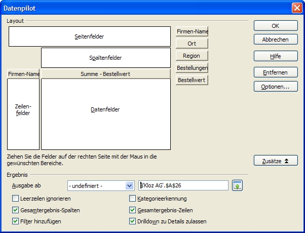Hier haben wir nun gewissermaßen einen Baukasten. (s. Abbildung 92), mit dem wir das Layout unserer Datenpilot-Tabelle zusammenstellen können.