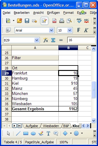 Im Beispiel gem. Abbildung 93 wurde „Bestellungen“ ins Datenfeld gezogen, „Ort“ ins Zeilenfeld, Spaltenfeld und Seitenfeld blieben frei.