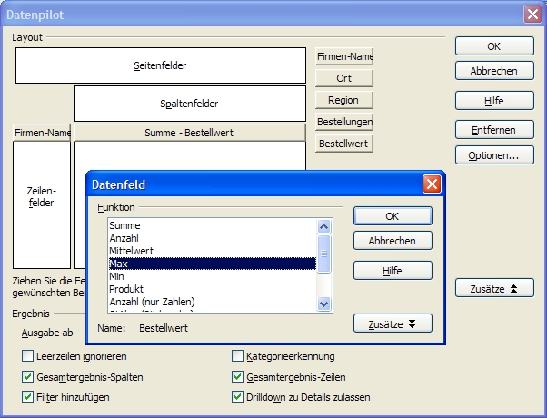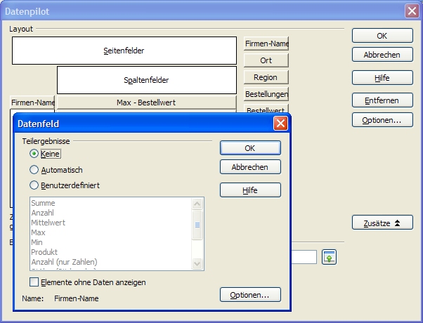 Klicken Sie dazu die Schaltfläche Auswertefunktionen des Datenpilot-Assistenten an (sie enthält in Abbildung 92 die Aufschrift Summe - Bestellwert) und wählen den Befehl Optionen.