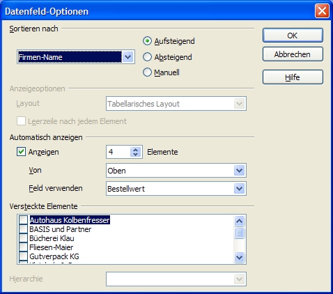 Im gleichen Dialogfeld (Abbildung 97) finden sich auch die Einstellungen für die Sortierfunktion. (Sortieren nach, oben).