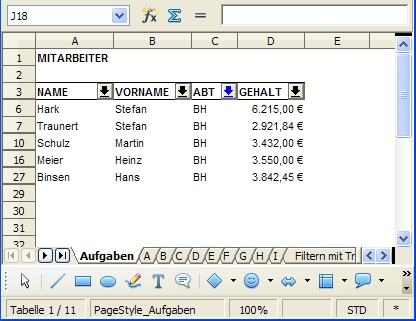 Mitarbeiter der Abteilung BH. Zeilen, die dem Filterkriterium nicht entsprechen,
