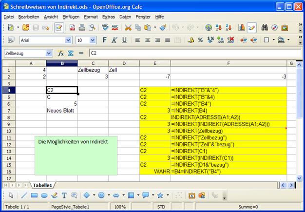 Das „Zusammenbauen“ eines Textstrings erfordert Übung, wer sich ein wenig unsicher fühlt, sollte die Beispiele in der Arbeitsmappe Schreibweisen von Indirekt.ods nachvollziehen.