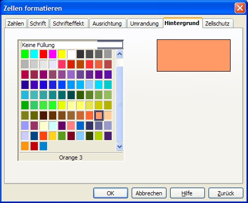 Mit dem folgenden Dialogfeld (Format – Zellen – Hintergrund) kann der markierte Bereich mit Hintergrundfaben und/oder Hintergrundmuster versehen werden.