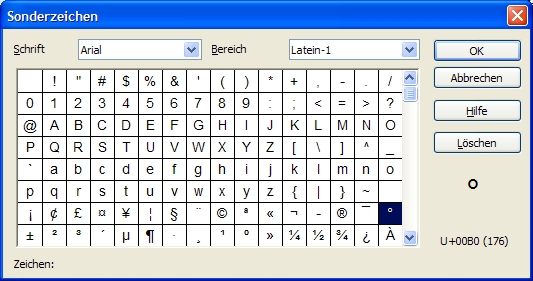 Um Sonderzeichen wie beispielsweise © o.ä. in einem Format benutzen zu können, wird der ASCII-Zeichencode mit gedrückter Alt-Taste über den Ziffernblock eingegeben. Die ASCII-Codierung können Sie beispielsweise im Dialog Abbildung 42 ablesen. (Befehl Einfügen – Sonderzeichen)