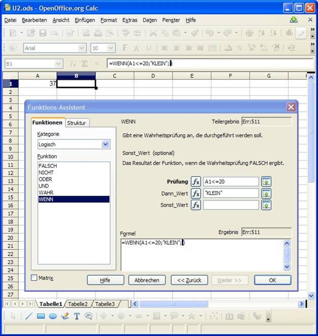 Dieses Textfeld Formel eignet sich vorzüglich für die Navigation in verschachtelten Formeln: Klicken Sie in einen Funktionsnamen, so zeigt Ihnen OO im Dialogfeld die zu dieser Funktion gehörenden Funktionsargumente. Sie können Änderungen vornehmen, ohne sich um die Syntax der Notation kümmern zu müssen.