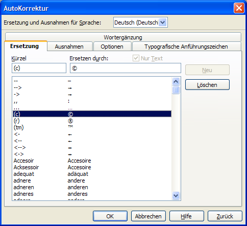 Sie gelangen zu dieser Tabelle über Extras – Autokorrektur, Register Ersetzung. Die standardmäßig vorhandenen Ersetzungspaare können Sie ergänzen/löschen.