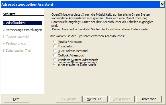 Es öffnet sich der Dialog Abbildung 67. Wählen Sie andere externe Datenquelle, wenn Ihre Adressdaten (wie in unserem Fall) als Calc- oder Excel-Tabelle vorliegen.