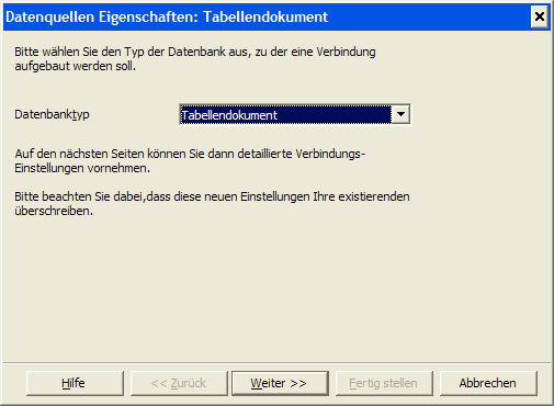 Wählen Sie als Datenbank-Typ Tabellendokument, wenn die Daten als Calc- oder