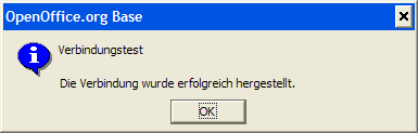 Sie sollten unbedingt die Verbindung testen (Button rechts unten). Wenn die Datenquelle akzeptiert wird, erscheint folgende Meldung.