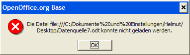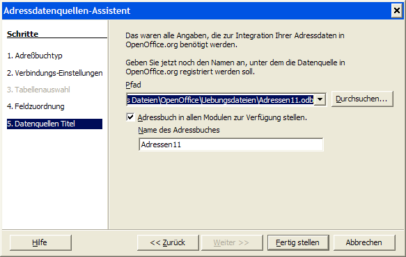 Tatsächlich hat OOWriter die Datei zu einer Datenbank-Datei umgewandelt (zu erkennen an der Dateiendung odb) einen neuen Namen vergeben und auch einen Speicherort ausgesucht. Sie können den Pfad, den Dateinamen (nicht die Erweiterung!) und das Adressbuch umbenennen, aber vermeiden Sie den Durchsuchen-Button!