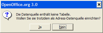 Adressdaten, die als OOWriter- oder Word-Tabelle vorliegen, werden nicht als gültige Datenquelle akzeptiert. Sie können diese Tabellen jedoch leicht in eine Calc- oder Excel-Tabelle kopieren. |