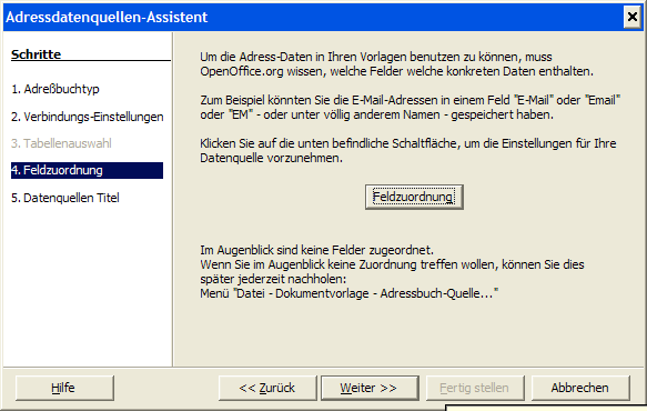 Feldzuordnung im folgenden Dialog überspringen wir mit weiter.
