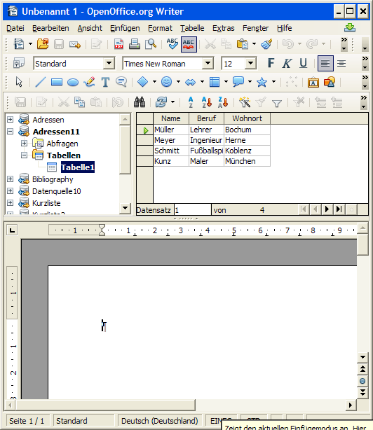 OOWriter zeigt oberhalb der Dokumentansicht den Seriendruck-Explorer (Abbildung