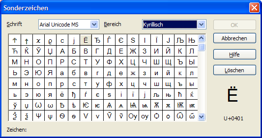 Dialogfeld erhält (oben rechts) ein zusätzliches Listenfeld Bereich, welches nahezu alle druckbaren Schriften der