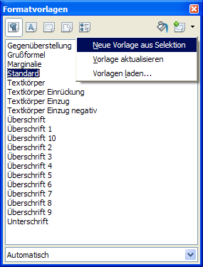 Vorsicht vor dem Aktivieren des Kontrollfelds Autom. aktualisieren: Alle direkten Formatierungen, die Sie an einem Absatz vornehmen, verändern dann unmittelbar die Formatvorlage dieses Absatzes und damit alle anderen Absätze, die mit derselben Formatvorlage formatiert sind. |