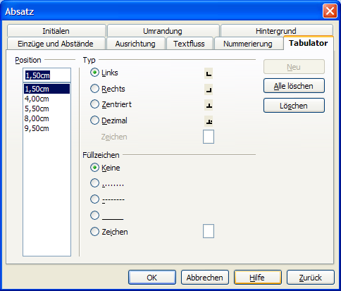 Alle Angaben, die Sie im Dialogfeld Tabulator definieren, beziehen sich immer nur auf den aktiven Absatz und nicht etwa auf das ganze Dokument.